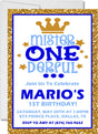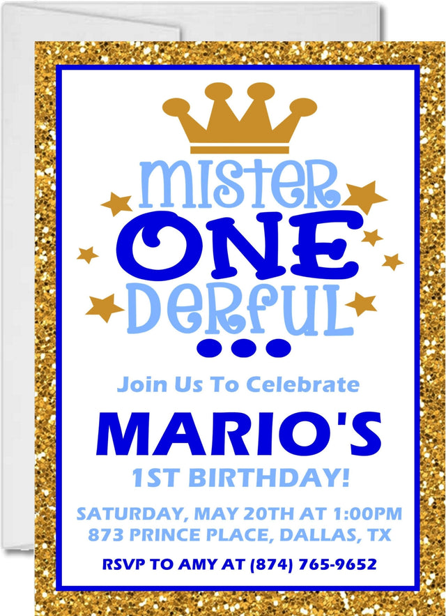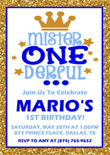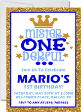 These Mister Onderful first birthday party invitations features the guest of honors name with a gold, royal and pastel blue prince themed design. Invitation cards are personalized with your party details in matching blue font styles.