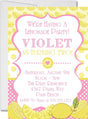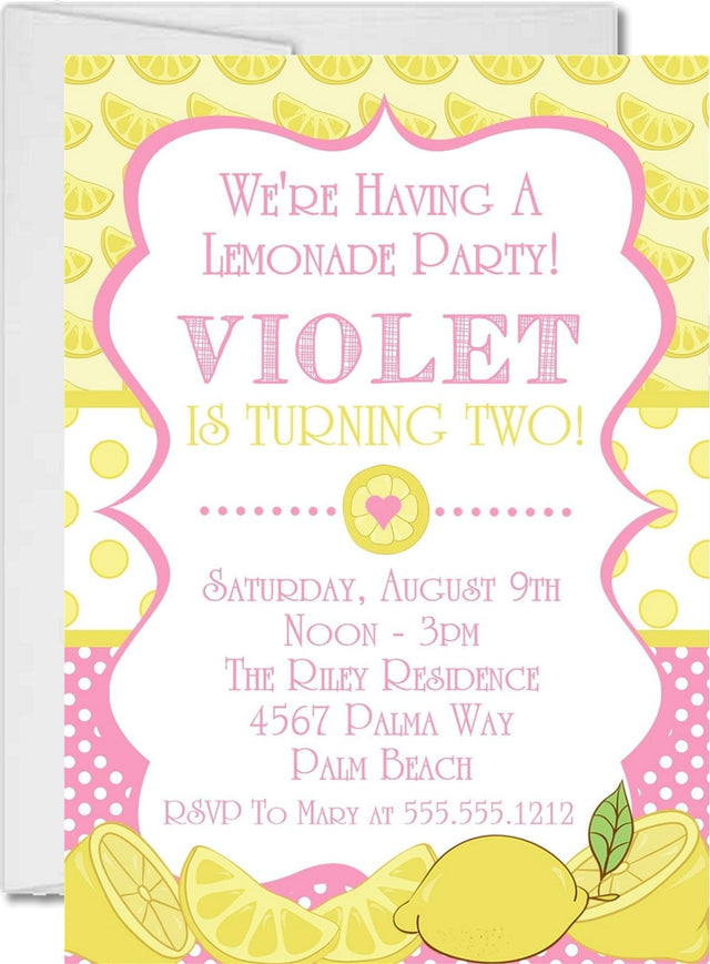 These fun and colorful pink lemonade birthday party invitations features lots of pretty yellow lemons along the bottom of the cards with three different lemon print backgrounds and are personalized with your party details in pink and yellow font styles.
