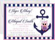 These girls nautical baby shower invitations feature a colorful navy and pastel pink design complete with a navy blue anchor with a little pink owl wearing a sailors hat. Invitation cards are typeset with your baby shower details in the matching navy and pastel pink colored text.