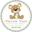 These Classic Teddy Bear Baby Shower Stickers feature an adorable brown bear with ABC blocks, framed by a soft blue scalloped border and stitched yellow accent. A timeless design perfect for baby boy shower favors, treat bags, and boxes.