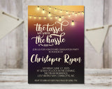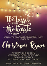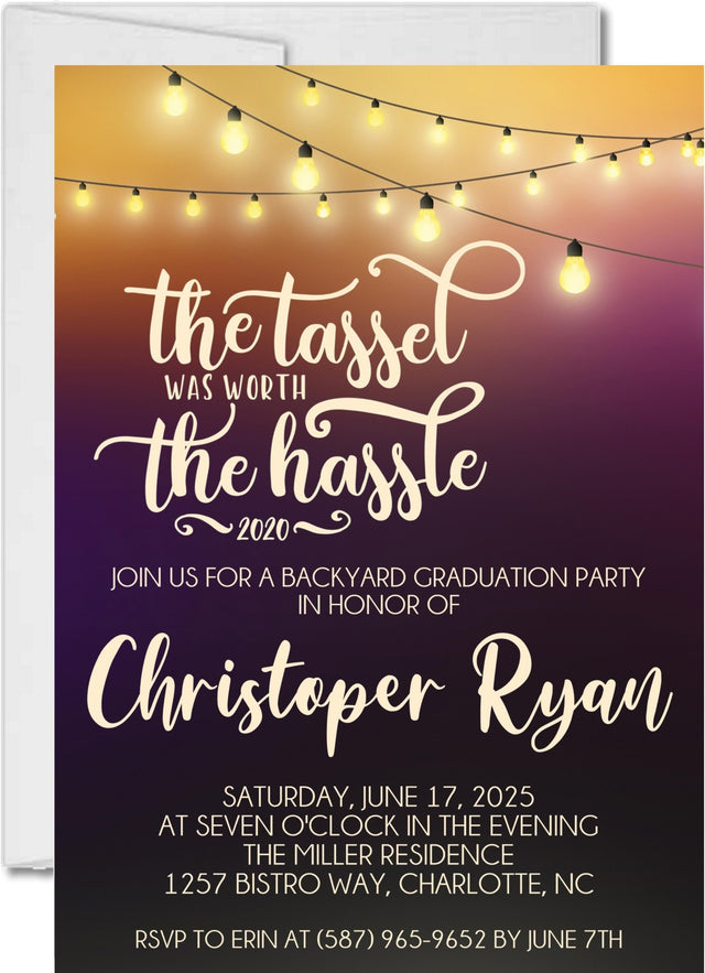 These backyard graduation party invitation card & envelope sets feature strands of amber bistro lights against a dark sunset night sky background designed with the phrase The Tassel Was Worth The Hassle in a matching script font style. The invitation cards are personalized with the graduates name and the special event details in two matching ivory colored font styles.