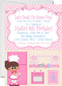 These sweet baking birthday party invitations feature a pretty baking themed design to include a cute little kitchen with a little girl baker along with a pink and white polka dot border. Invitation cards are personalized with your special birthday details in matching pink and blue font styles.