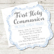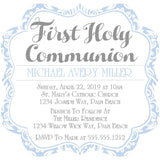 These die cut shaped First Communion invitations feature a blue and white damask border and are designed with the guest of honors name, date, time and location of the church ceremony and celebration details in two fancy blue and dark grey font styles.