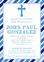 These boys baby dedication invitations feature a blue and white striped border and are designed with the guest of honors name, date, time and location of the church ceremony and celebration details in two fancy blue font styles.