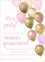 These Quinceanera invitations feature pretty gold and pastel pink decorated balloons and are personalized with your event details in two beautiful pink font styles.