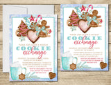 These Christmas cookie exchange party invitations features cute Christmas cookies and hot chocolate with a winter snowflake border. Invitation cards are personalized with your fun party details in fun and festive font styles.