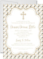 These gender neutral baptism invitations feature a beige quarterfoil background design and are designed with a light brown cross, the guest of honors name, date, time and location of the church ceremony and celebration details in two fancy beige font styles.