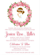 Our personalized girls First Communion invitations feature a pink watercolor floral wreath against a white background.  Invitation cards are designed with the guest of honors name, date, time and location of the church ceremony and celebration details in two rose pink font styles.  Invitation cards are customized with the girl character of your choice.