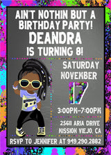These girls hip hop themed birthday party invitations features a bright and colorful neon paint splash border against a dark chalkboard background and are personalized with your event details in bold and fun font styles.