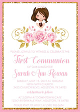 Our personalized girls First Communion invitations feature a pink and gold border against a white background with a pink rose and gold flourish design with a girl communion character at the top. Invitation cards are designed with the guest of honors name, date, time and location of the church ceremony and celebration details in two pastel pink font styles. Invitation cards are customized with the girl character of your choice.