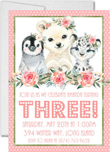These girls winter birthday party invitations features a polar bear cub, a baby penguin and a little snow leopard against a white background and pastel pink border around the cards. Invitation cards are personalized with your party details in two pretty pastel pink font styles.