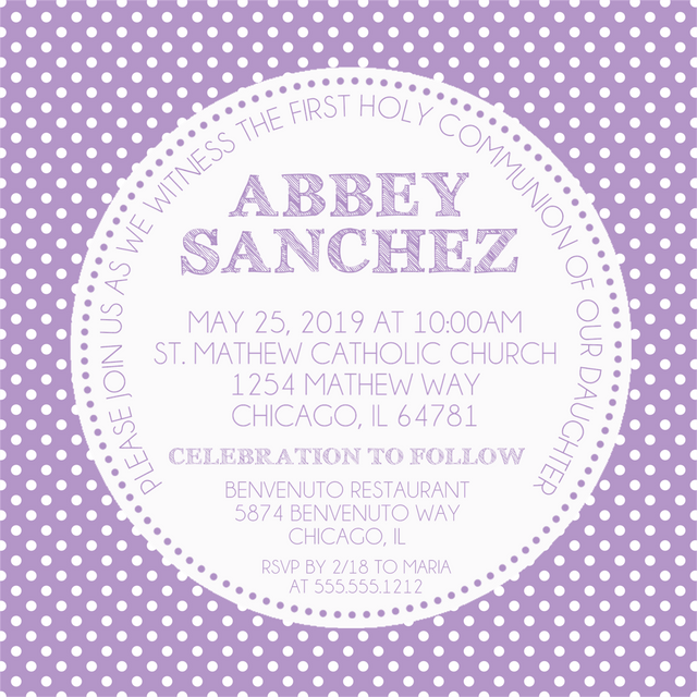 These square First Communion invitations feature a lavender and white polka dot pattern with your special event details printed in the middle of the cards. Invitation cards are typeset with the guest of honors name, date, time and location of the church ceremony and celebration details in two matching lavender font styles.