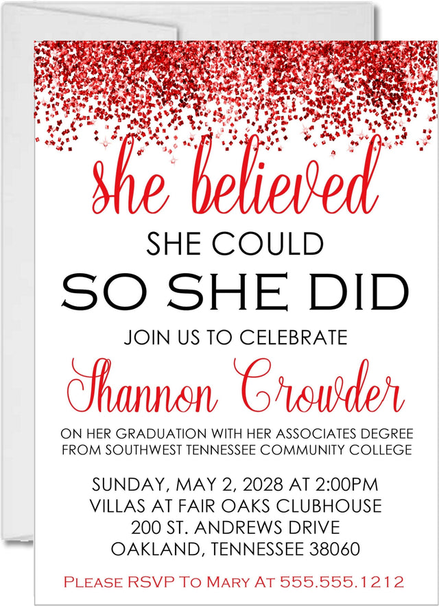 These red, black and white graduation party invitation cards feature a bright red border of diamond confetti along the top of the cards along with the phrase She Believed She Could So She Did. The invitation cards are personalized with the graduates name and the special event details in two red and black font styles.