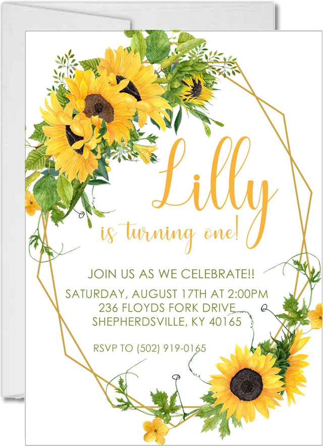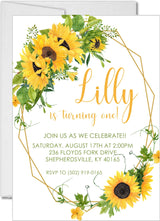 These cheerful sunflower birthday party invitations features a bright and vibrant sunflower frame against a white background and are personalized with your party details in matching green and yellow font styles printed in the middle.