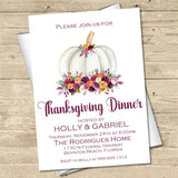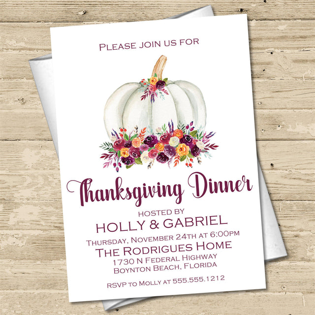These Thanksgiving dinner invitations feature an white watercolor pumpkin with colorful flowers and are typeset with your event details printed in two matching burgundy font styles.