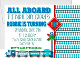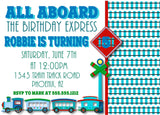 These fun train birthday party invitations feature a colorful blue, red and turquoise train against a white background and a train track pattern border along the side of the cards. Invitation cards are personalized with your special event details in two matching blue and turquoise themed font styles.