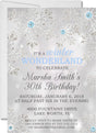 These winter wonderland sweet 16 birthday party invitations feature a blue and white snowflake background and are personalized with your event details in two fancy blue and grey font styles.